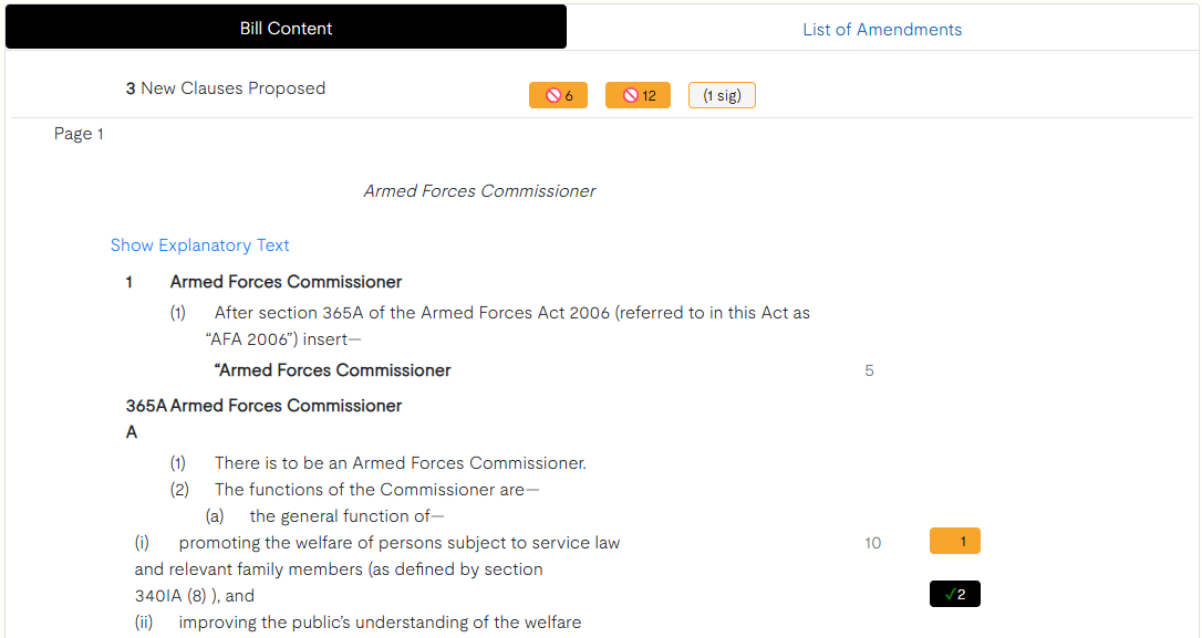 Amendments are shown as small buttons to the right of the bill text to which they apply, coloured in the manner described above. Clicking an amendment button toggles its selection, updating the bill text to reflect the changes proposed by that amendment.