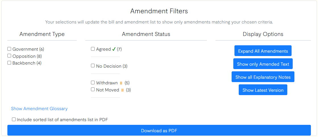 This section contains the amendment filter box, allowing users to filter amendments by type and status, as well as display options to customise the viewing experience.