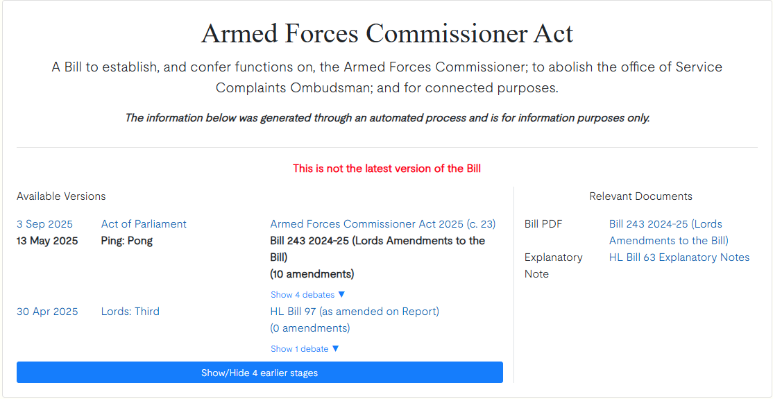 On the left-hand side, all stages of the bill are displayed in chronological order. Selecting a particular stage reveals the text current at that stage, along with any amendments tabled at that time. Beneath each stage, related debates can be accessed via a dropdown menu. Changing the selected stage updates the page to display the corresponding version and the amendments tabled from that point.