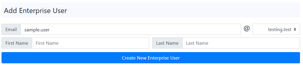 Enterprise Users can be added by completing the new Enterprise User form on the Enterprise tab. The Enterprise User will be created immediately upon completion of the form.