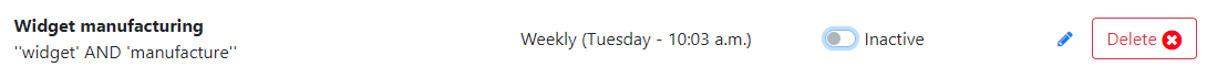 Once the alert has been created, it will appear in the list of existing alerts. The alert can be deleted or suspended at any time.