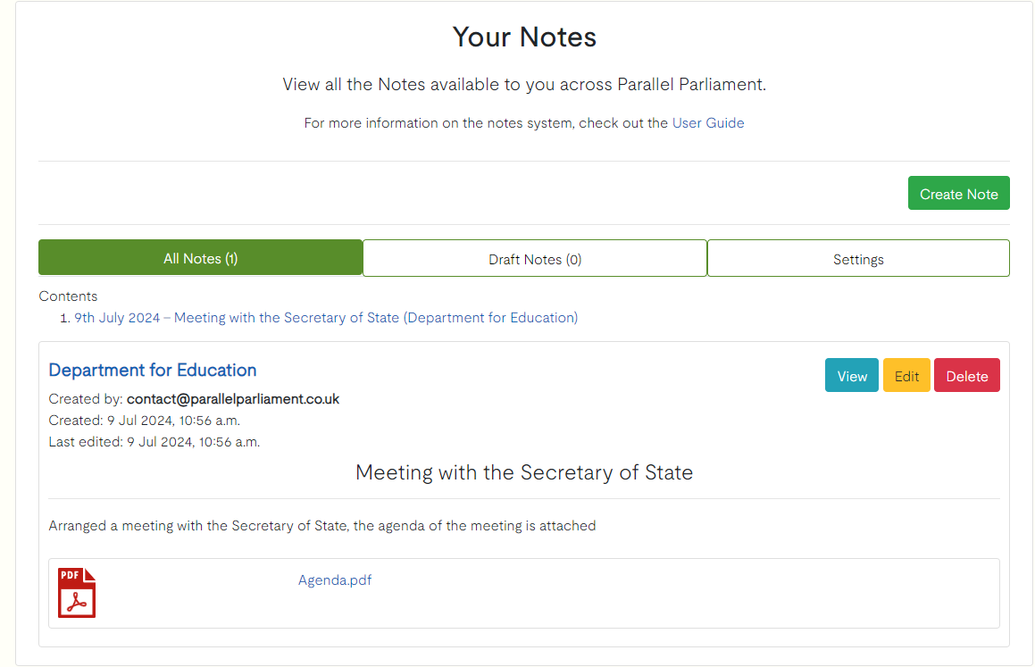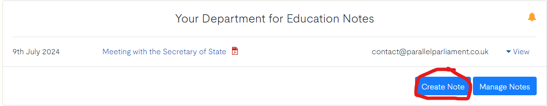 Notes allow you to track, share and record your own information on MPs/Lords, Departments and Legislation, or just as general unlinked notes. Notes can include attachments which can be downloaded again in the future.